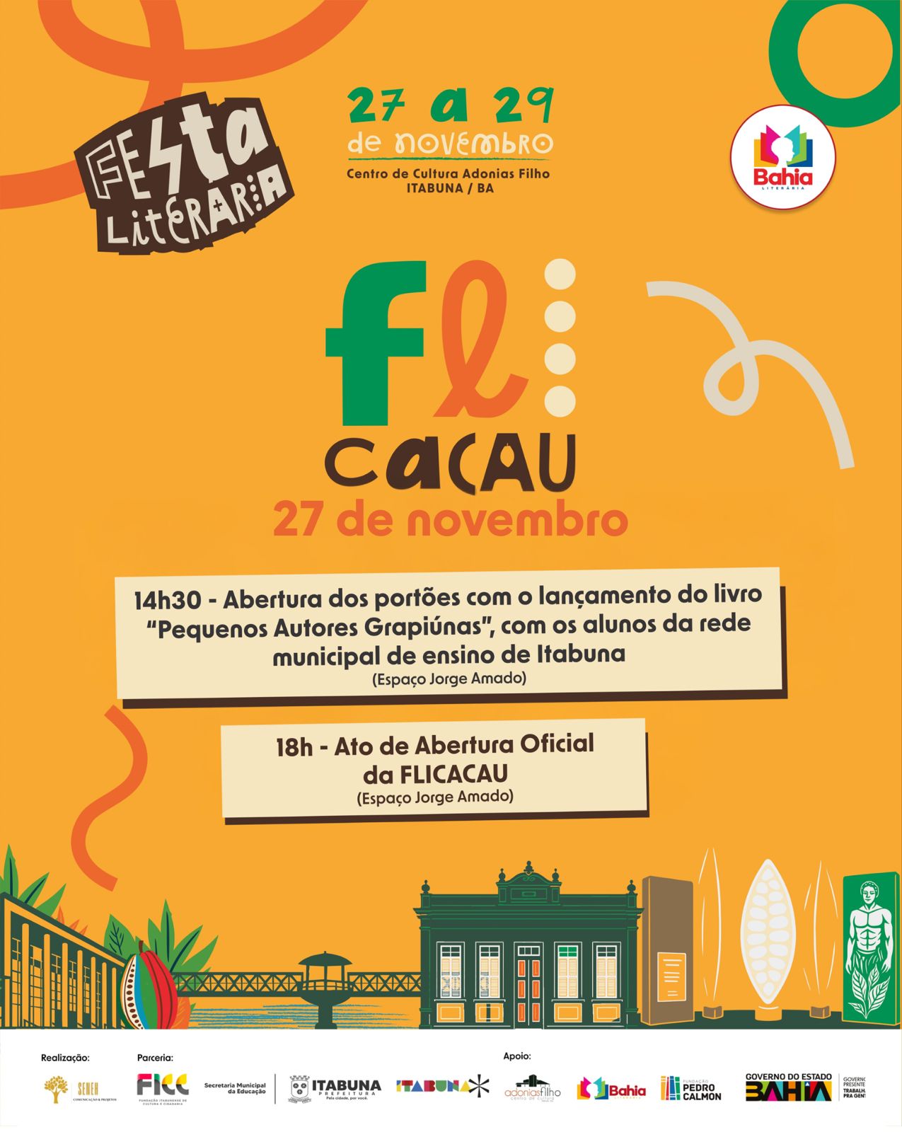- 14h30 - Abertura dos portões com o lançamento do livro “Pequenos Autores Grapiúnas”, com os alunos da rede municipal de ensino de Itabuna (Espaço Jorge Amado)