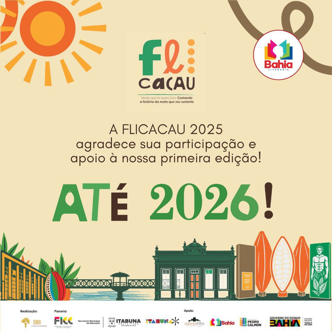 Agradecemos a Deus por nos permitir essa grandiosa entrega e ao Governo do Estado da Bahia, por meio do Projeto Bahia Literária, pelo apoio. Agradecemos também à Prefeitura de Itabuna, à FICC, às Secretarias envolvidas, aos produtores locais e a todos os profissionais que caminharam conosco da montagem à curadoria, da comunicação à logística, da recepção à limpeza.